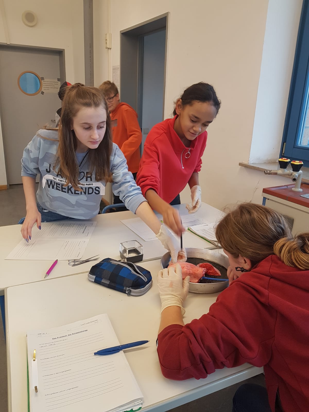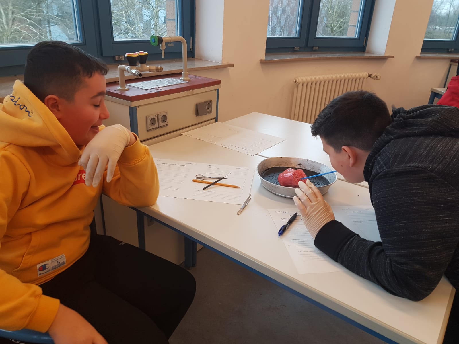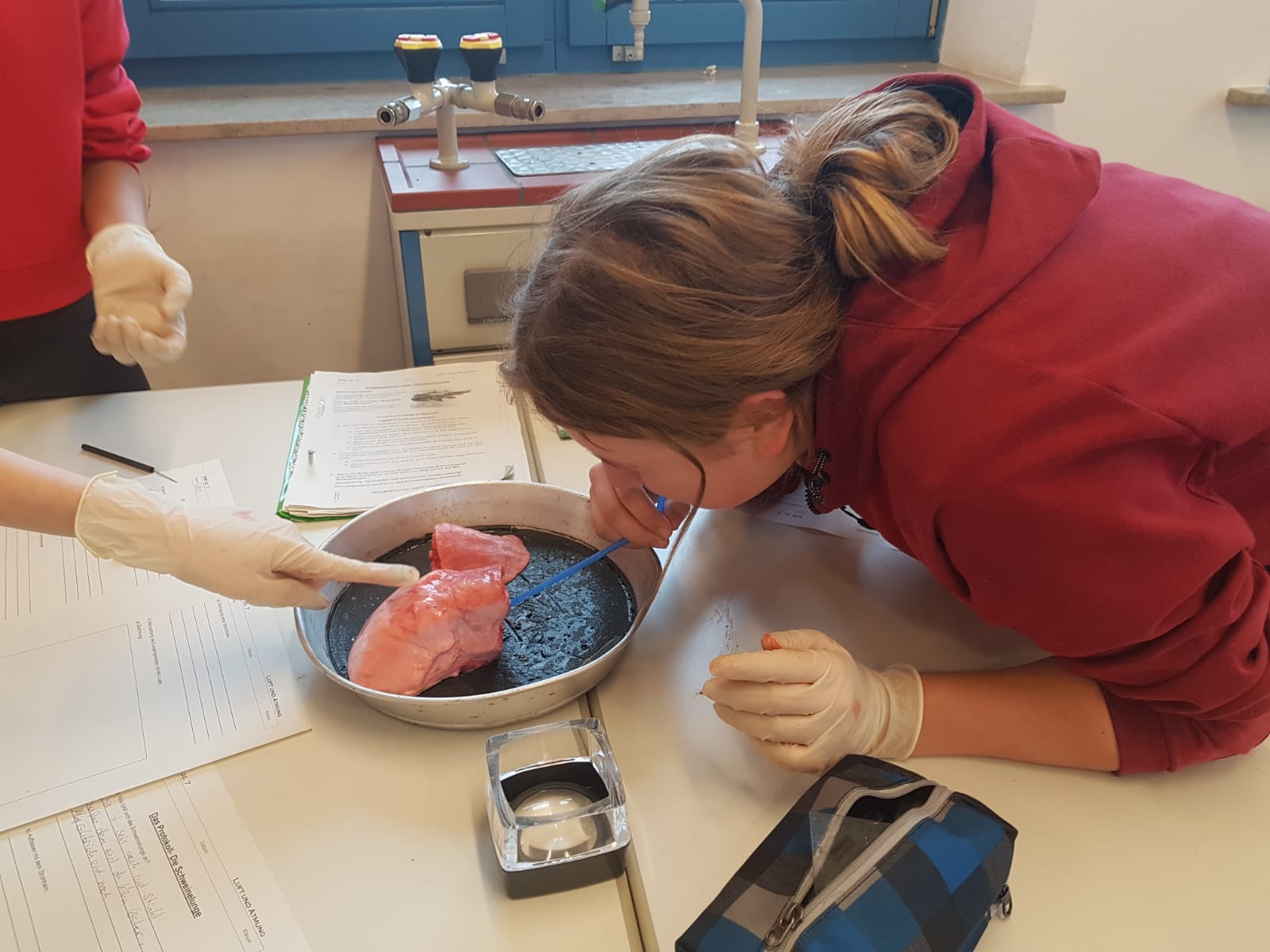 Zum Jahresanfang haben die Klasse 7A und 7D im NW-Unterricht eine Schweinelunge präpariert. Die Klasse fand dieses Experiment sehr gut und spannend, da sie erfahren konnten, wie eine Lunge funktioniert und aussieht. Viele Schüler/innen fanden es interessant, wie sie riecht und was passiert, wenn man sie aufbläst. Das Experiment ist insgesamt sehr gut gelaufen und in der Klasse herrschte eine ausgelassene Stimmung. Aufgaben der Schüler/innen waren z. B. das Anfassen und Aufblasen der Lunge, ein größeres Loch in die Lunge schneiden und mit der Schere/ Skalpell eine Bronchiole zu verfolgen.