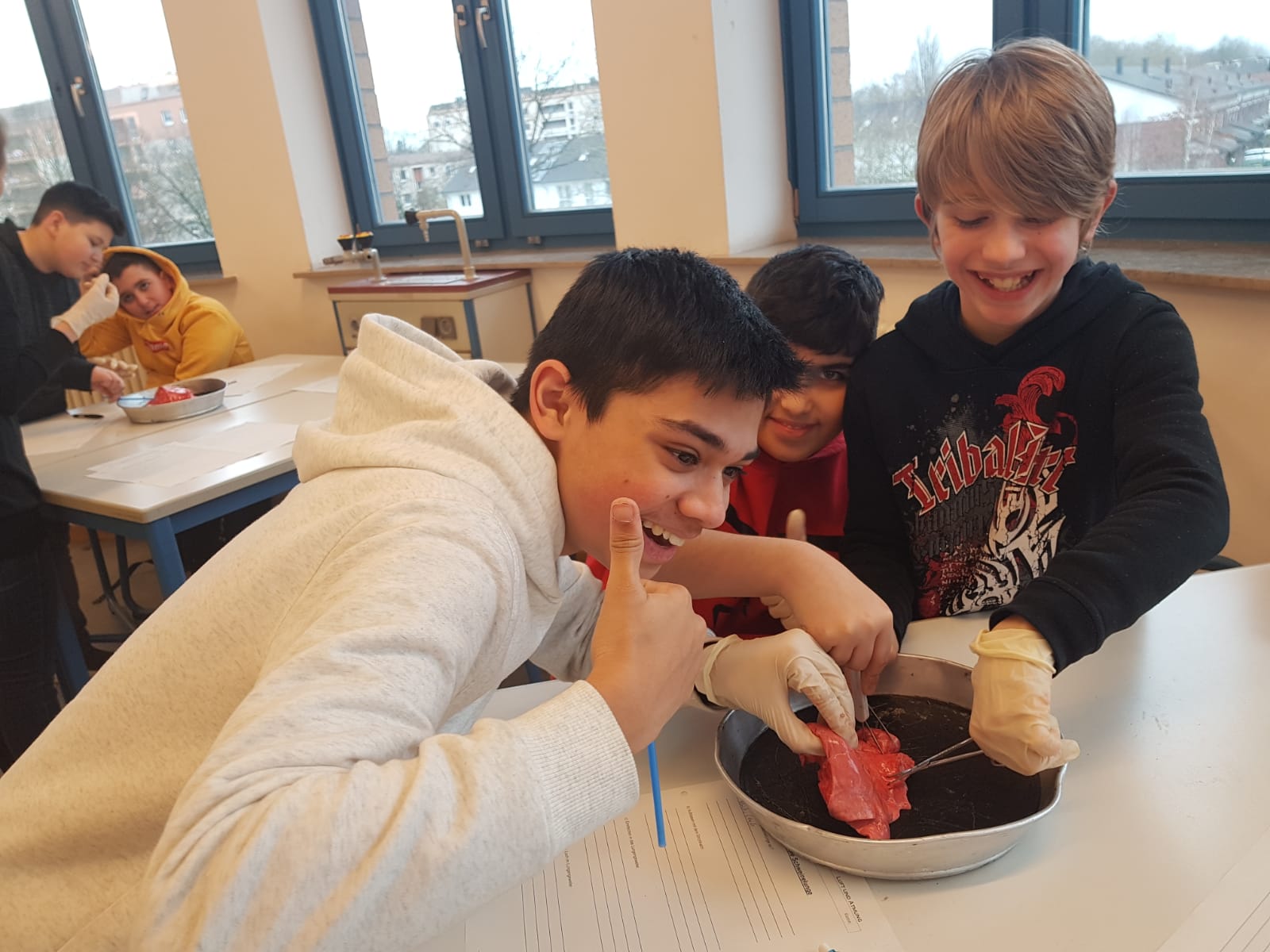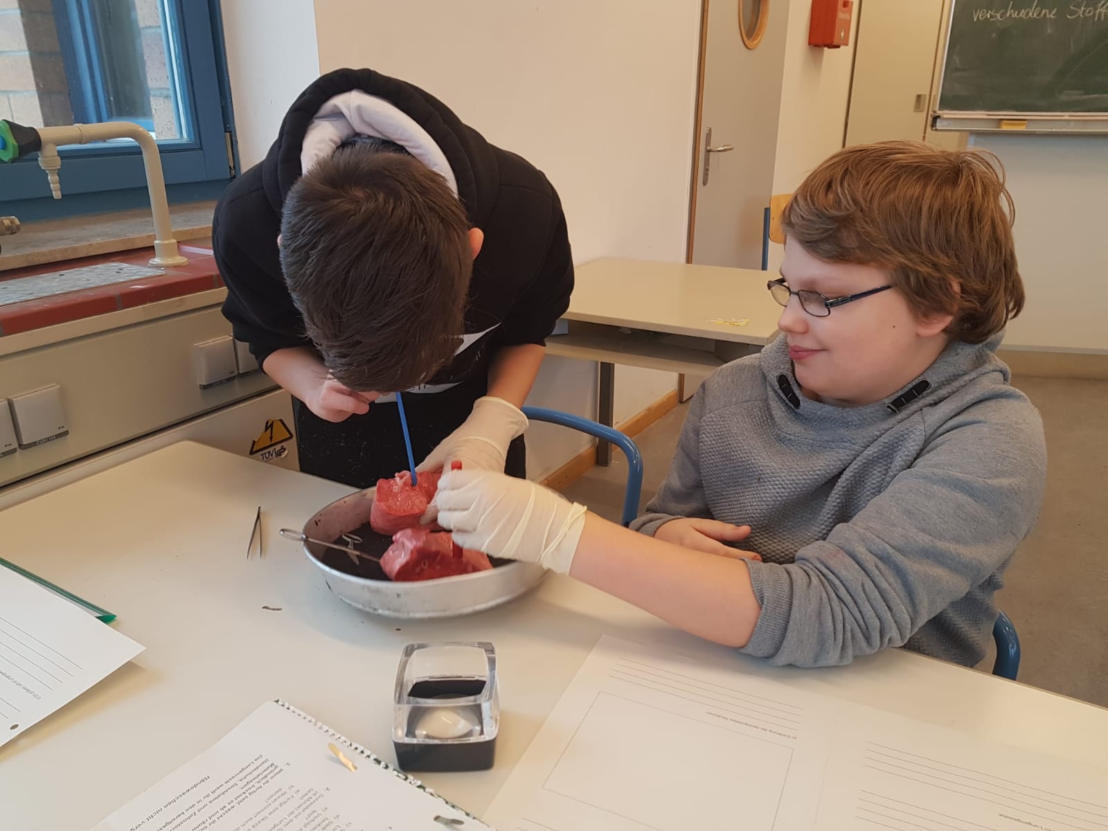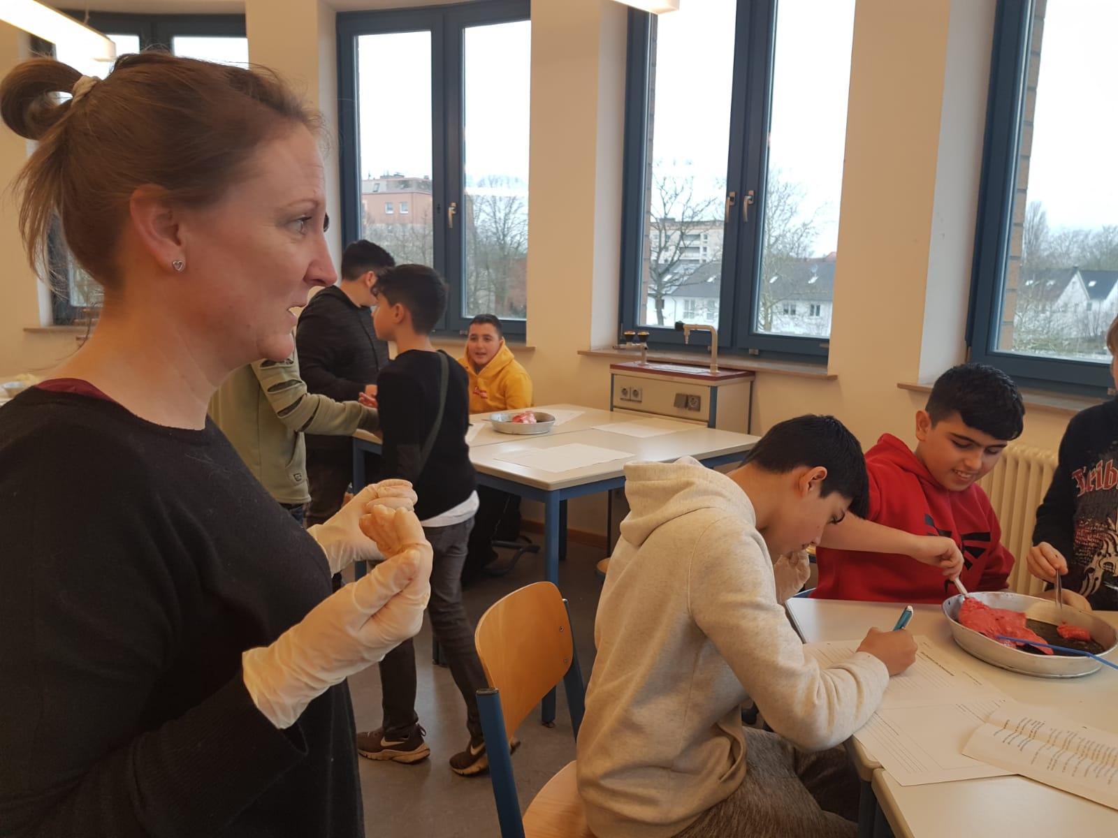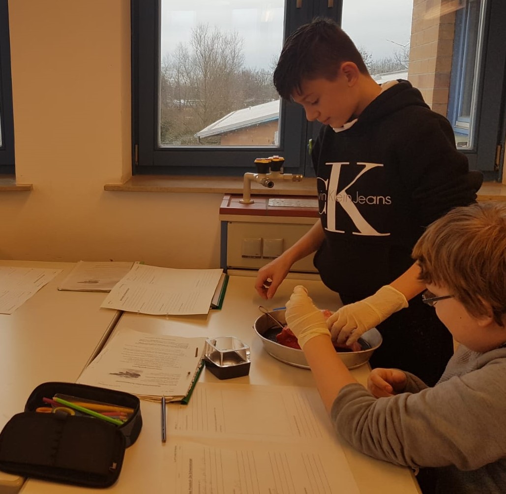 Zum Jahresanfang haben die Klasse 7A und 7D im NW-Unterricht eine Schweinelunge präpariert. Die Klasse fand dieses Experiment sehr gut und spannend, da sie erfahren konnten, wie eine Lunge funktioniert und aussieht. Viele Schüler/innen fanden es interessant, wie sie riecht und was passiert, wenn man sie aufbläst. Das Experiment ist insgesamt sehr gut gelaufen und in der Klasse herrschte eine ausgelassene Stimmung. Aufgaben der Schüler/innen waren z. B. das Anfassen und Aufblasen der Lunge, ein größeres Loch in die Lunge schneiden und mit der Schere/ Skalpell eine Bronchiole zu verfolgen.