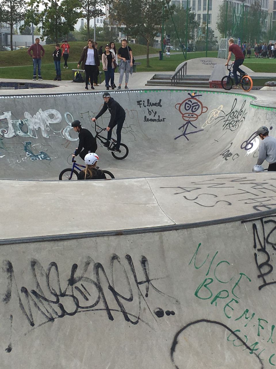 Drei Oberschulen im Bremer Westen haben gemeinsam die Ferien eingeläutet und am letzten Schultag noch an einem Sportfest teilgenommen. Unter der Überschrift „Überseespiele – Walle bewegt alle!“ lockten die Organisatoren des Sportgartens über 500 SchülerInnen der Helgolander, des Waller Rings und der Gesamtschule West auf das neue Gelände des Sportgartens in der Überseestadt. Von 9.30 Uhr bis 14.30 Uhr konnten die Acht- bis Zehntklässler an vielen interessanten Workshops teilnehmen. Dabei war die Trendsportart Parcours heiß begehrt, aber auch Skateboarden, BMX fahren, Speedminton, Hip Hop tanzen etc. kamen gut an. Alle Workshops wurden von engagierten Trainern angeboten, die den Kids viele Tipps gaben.