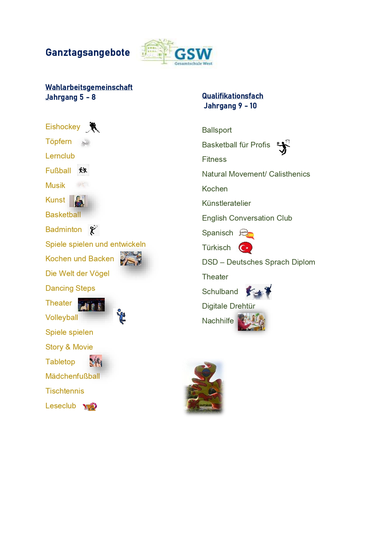 Die GSW versucht jedes Jahr möglichst viele verschiedene WAGs anzubieten und Themengruppen abzudecken, damit jeder Schüler und jede Schülerin das passende Angebot für sich findet. Auch dieses Jahr haben wir wieder ganz unterschiedliche Angebote, beispielsweise aus dem künstlerischen, musischen, sportlichen oder auch schulischen Bereich.